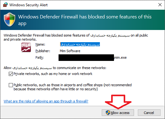 نکته ۲ : در هنگام اولین اجرای سرویسدهنده اگر با پیام ذیل مواجه شدید حتماً دسترسی تأیید را برای سرویسدهنده داخلی یا خارجی اعمال نمایید :